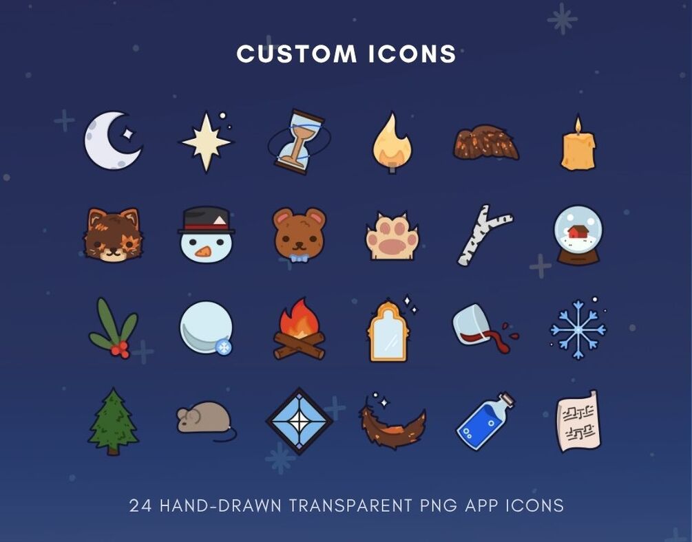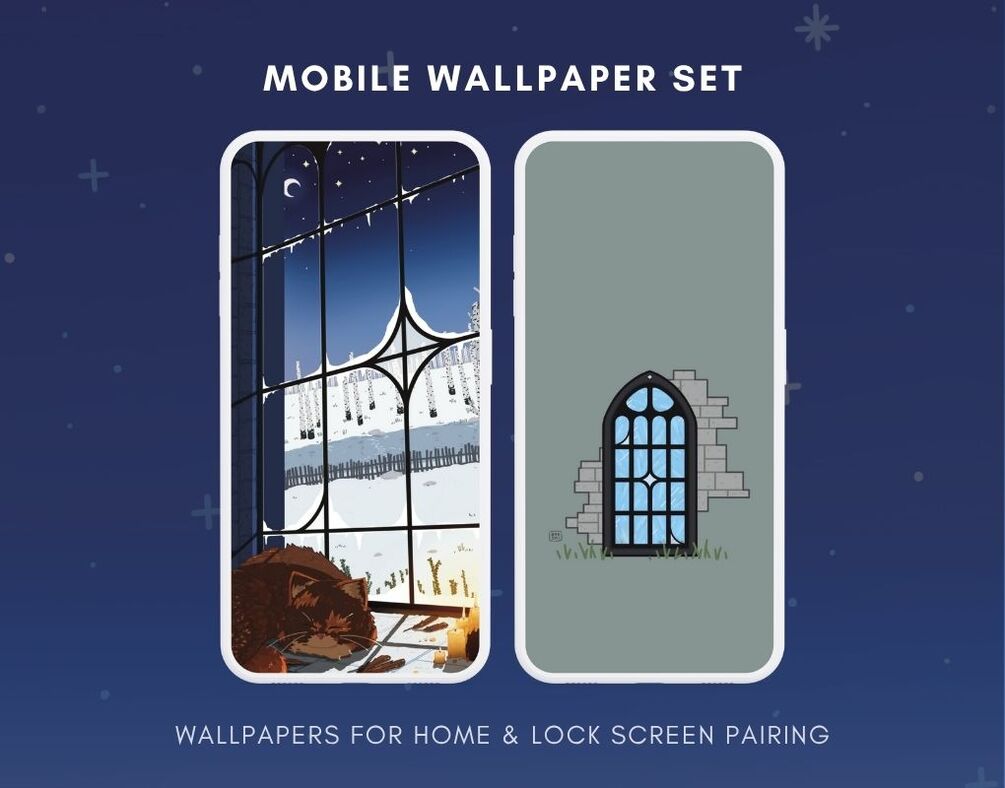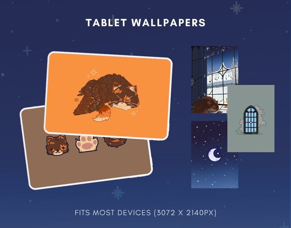 A collection of hand-drawn illustrated digital wallpapers and app icons inspired by a cute kitty on a winter day (possibly from a popular RPG). This deluxe pack includes digital wallpapers for mobile and tablet/desktop, and a custom app icon set.