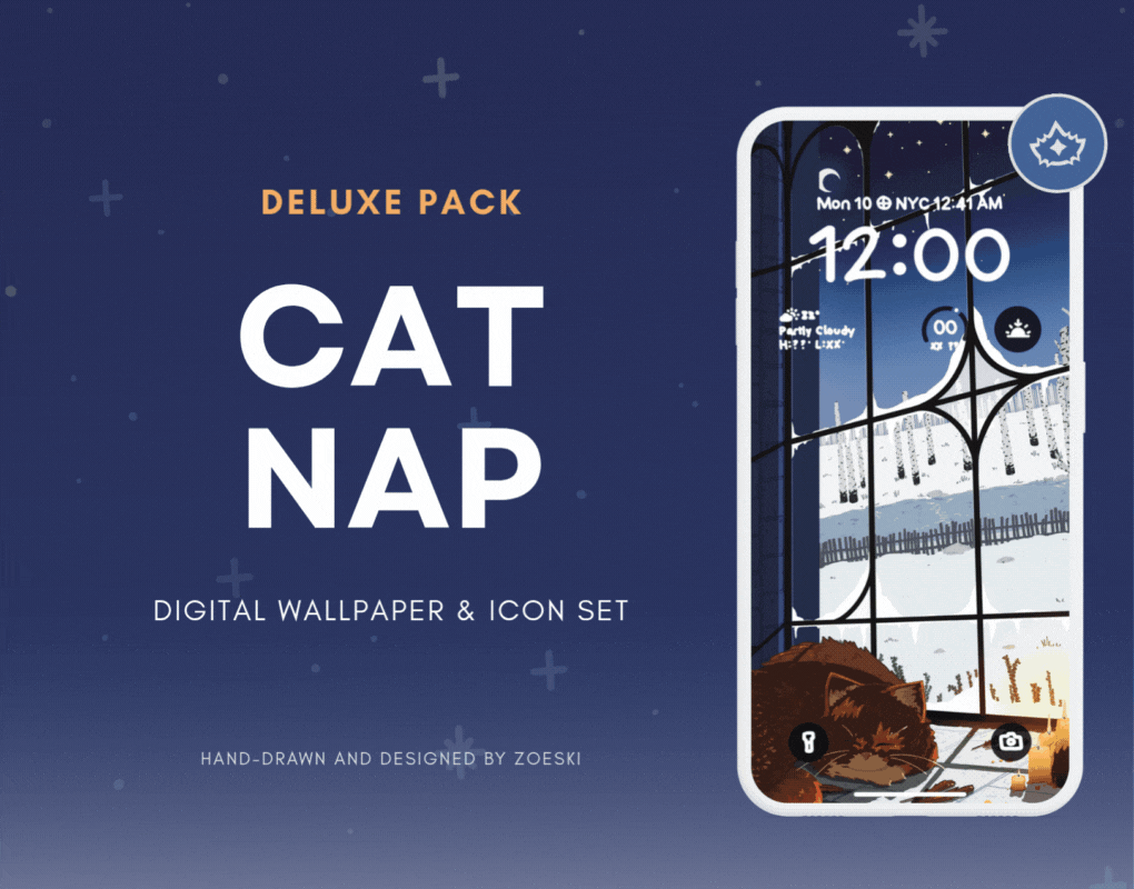 CAT NAP - Digital Wallpaper & Icon Set | Cute Art | Sleeping Cat | Winter Night