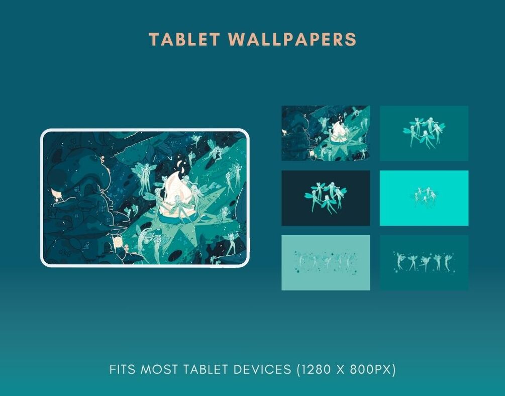 A collection of hand-drawn illustrated digital wallpapers inspired by fairies. This standard pack includes digital wallpapers for mobile, tablet, and desktop.