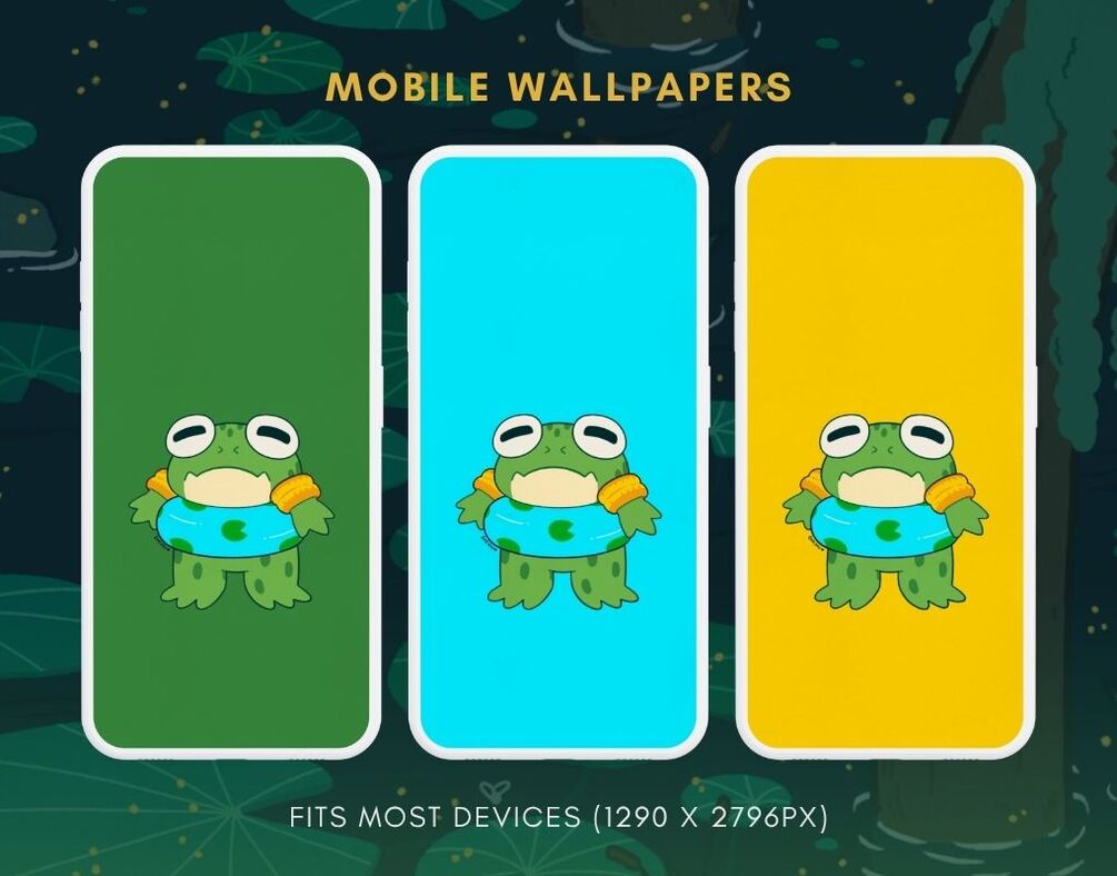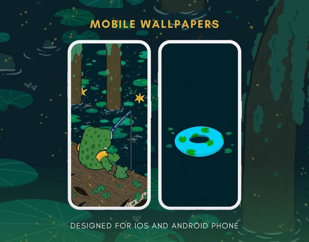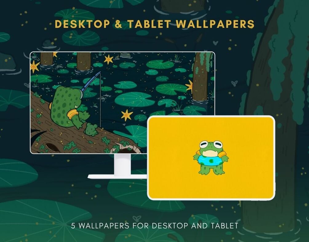A collection of hand-drawn illustrated digital wallpapers inspired by frogs. This standard pack includes digital wallpapers for mobile, tablet, and desktop.