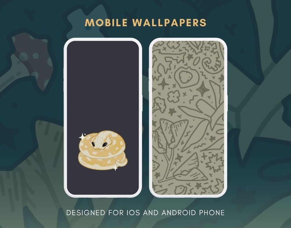 A collection of hand-drawn illustrated digital wallpapers and app icons inspired by foliage and snakes. This deluxe pack includes digital wallpapers for mobile, tablet, and desktop, and a custom app icon set.